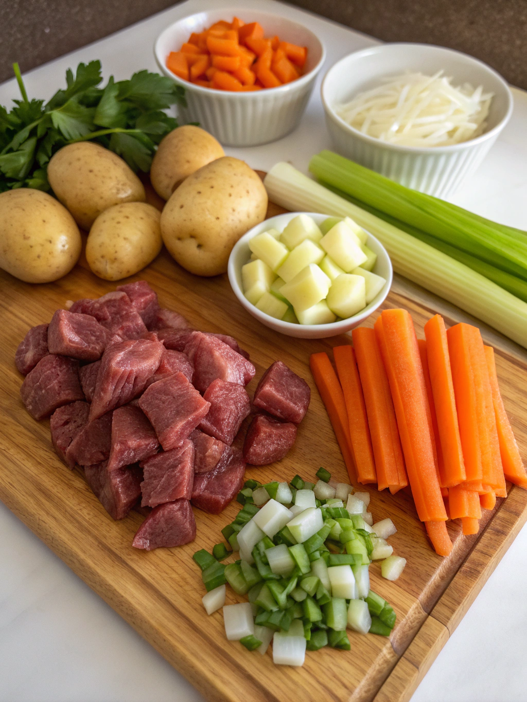 Inizia tagliando la carne a cubetti regolari di circa 3-4 cm. La dimensione uniforme garantisce una cottura omogenea. Pela e taglia le patate in pezzi leggermente più grandi della carne, poiché tenderanno a ridursi durante la cottura. Trita finemente cipolla, carote e sedano per creare un soffritto aromatico che sarà la base del tuo spezzatino con patate. Asciuga bene la carne con carta da cucina: questo passaggio è fondamentale per ottenere una rosolatura perfetta.